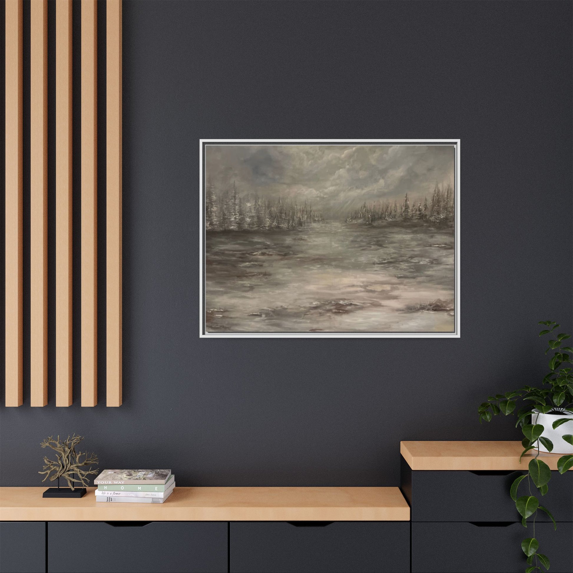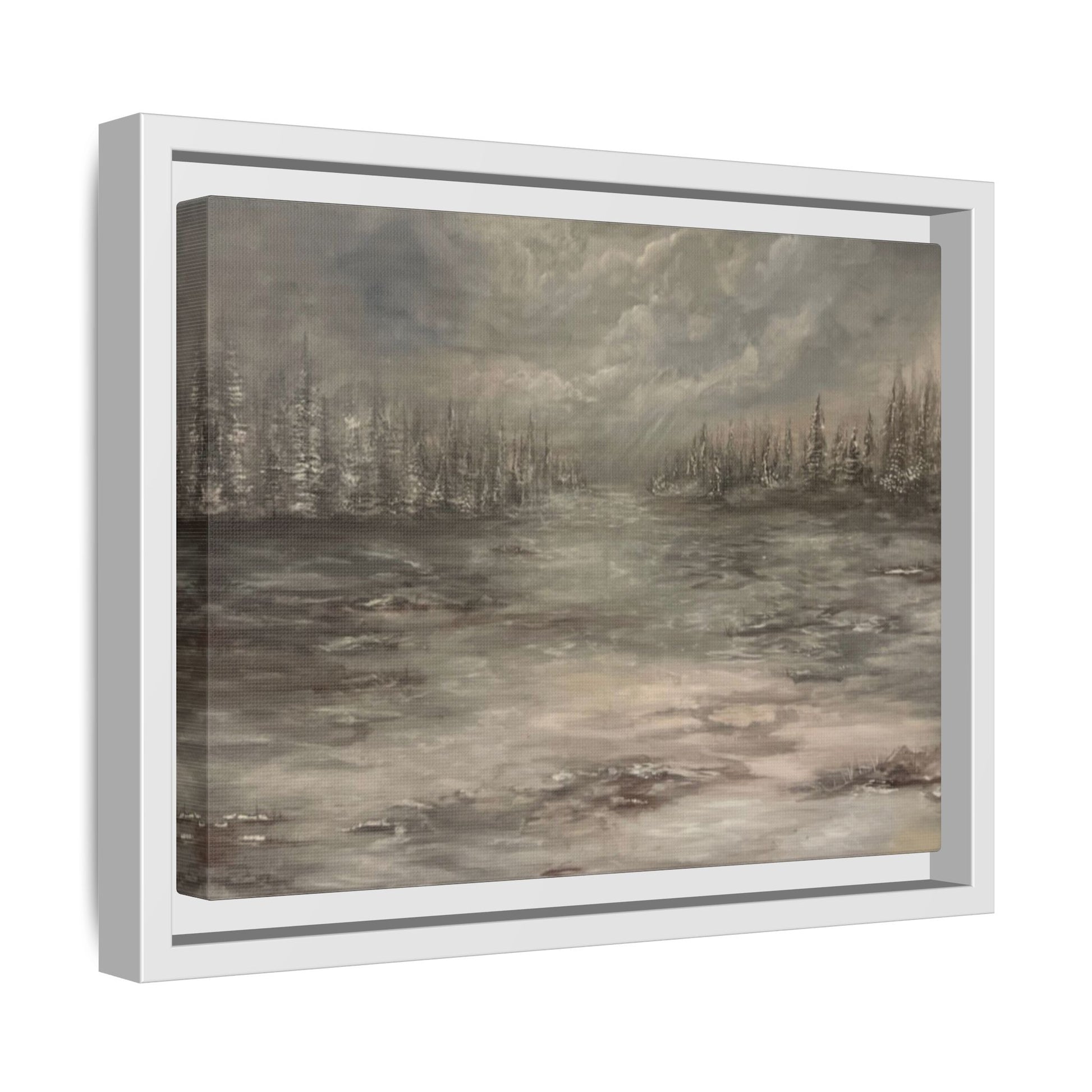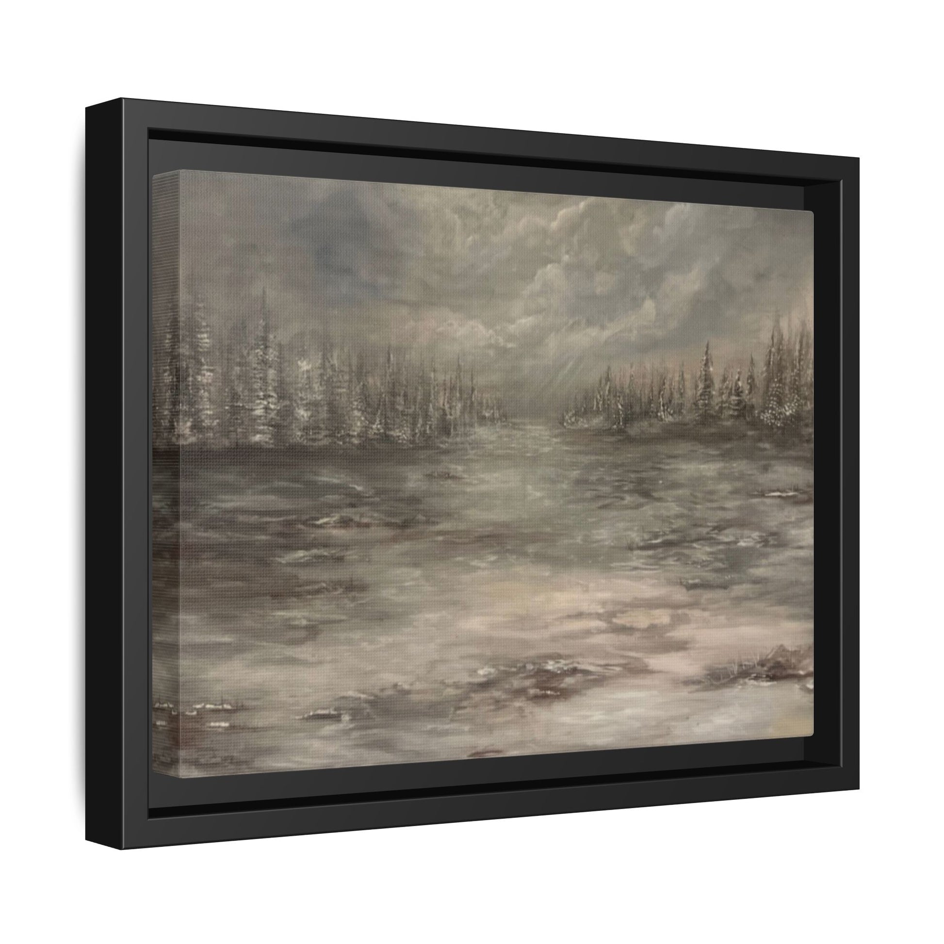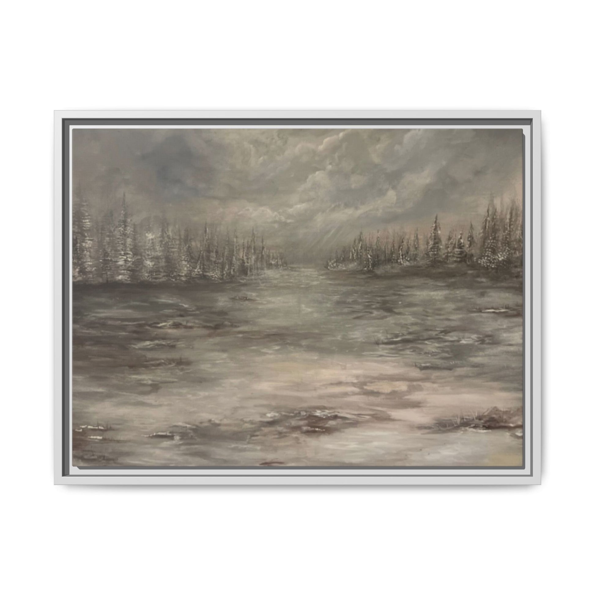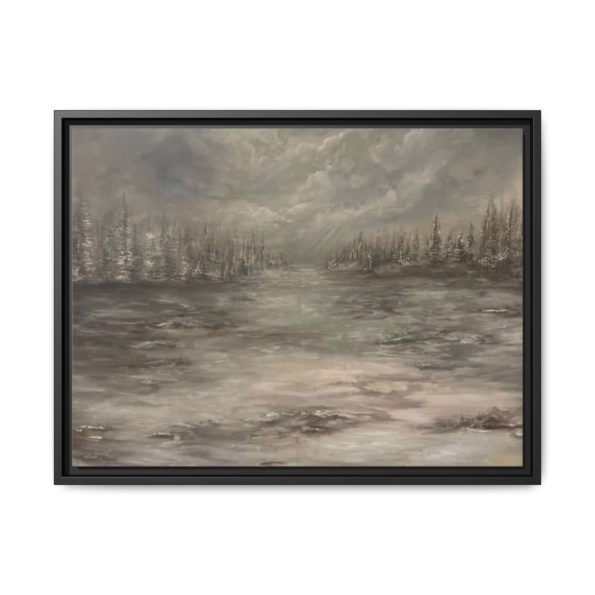A serene winter landscape stretches beneath a brooding, cloud-filled sky. Frosted evergreens line the horizon, their reflections softened by the icy ground below. Muted grays and whites blend seamlessly, evoking the stillness and quiet beauty of a snow-covered valley just before the storm breaks or the light returns.