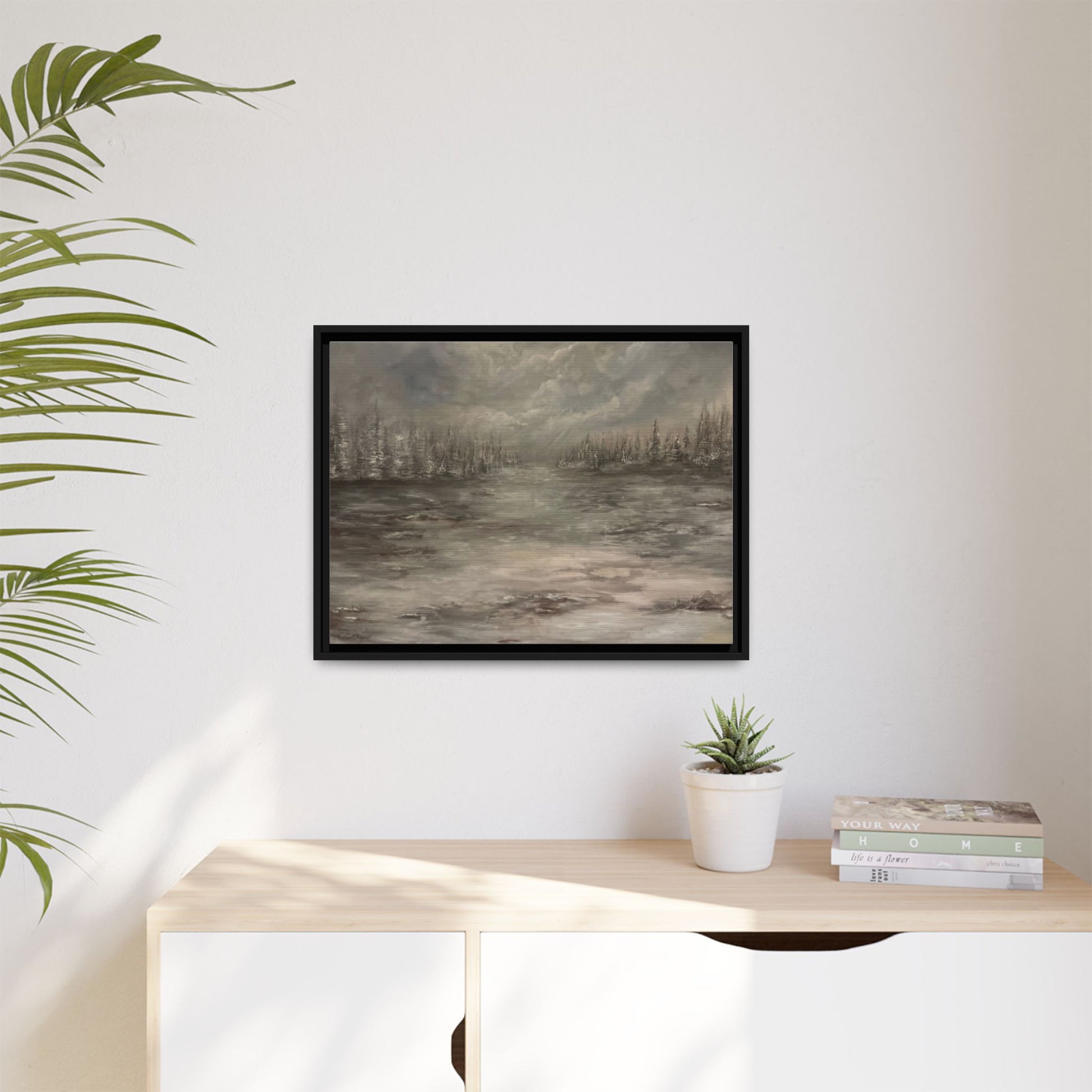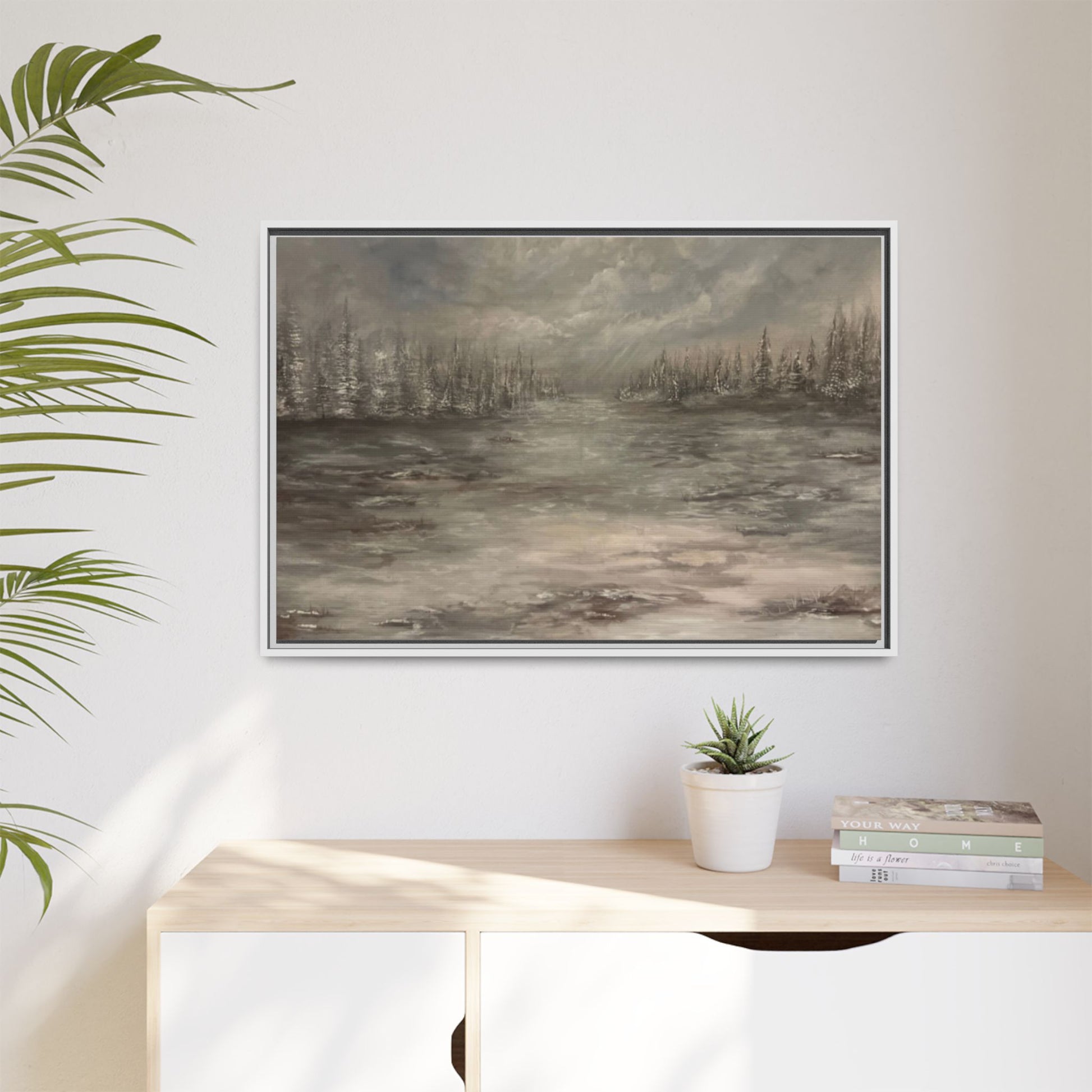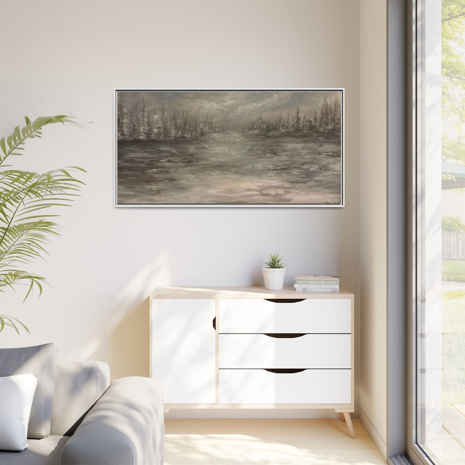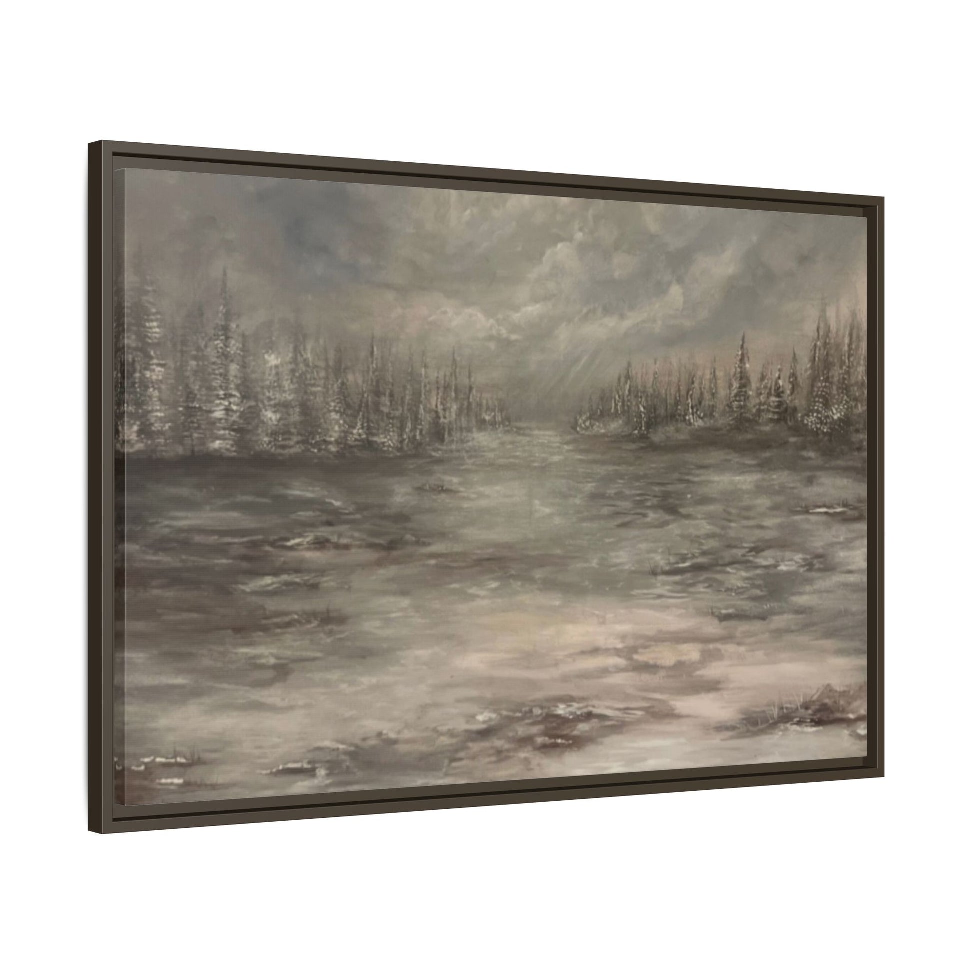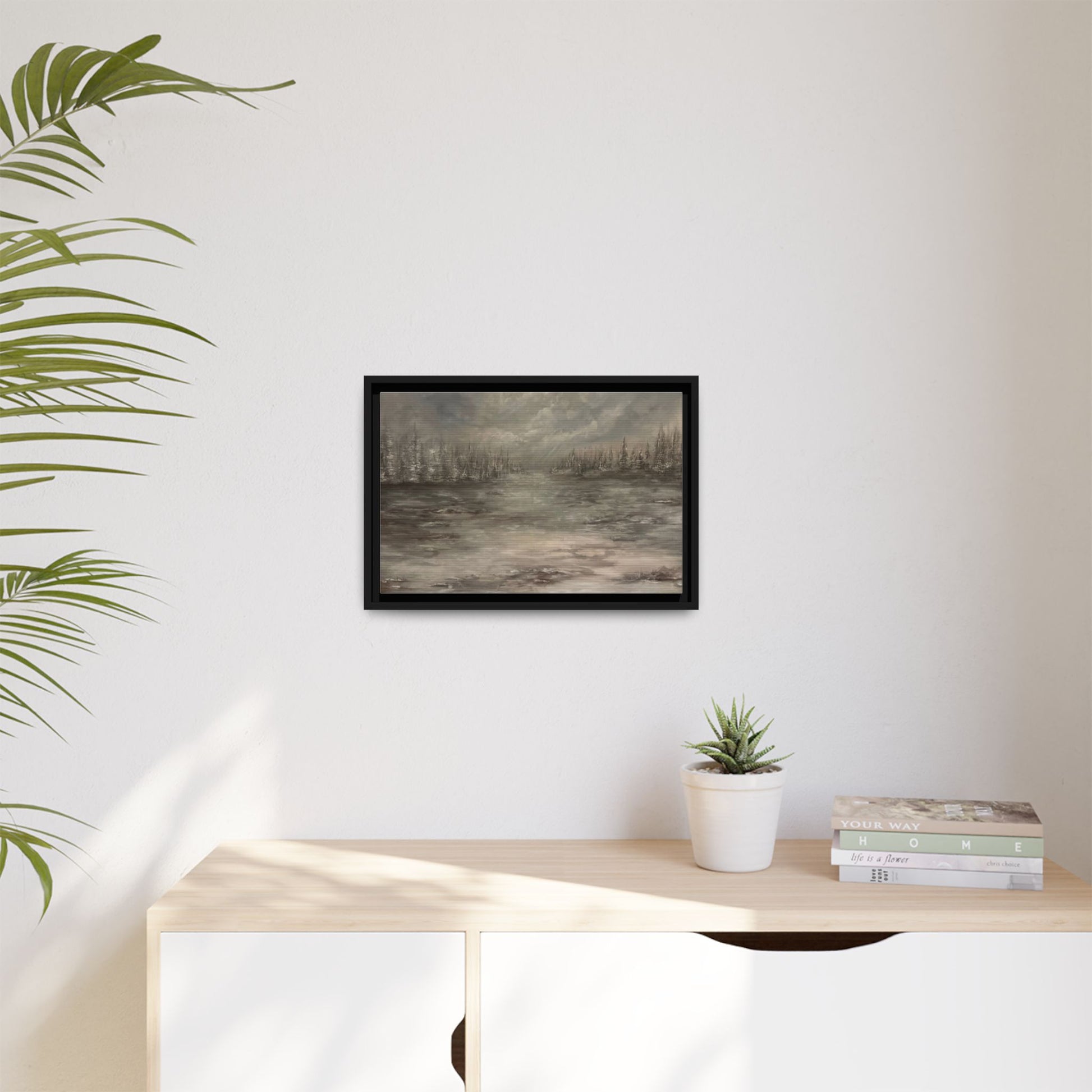 A serene winter landscape stretches beneath a brooding, cloud-filled sky. Frosted evergreens line the horizon, their reflections softened by the icy ground below. Muted grays and whites blend seamlessly, evoking the stillness and quiet beauty of a snow-covered valley just before the storm breaks or the light returns.