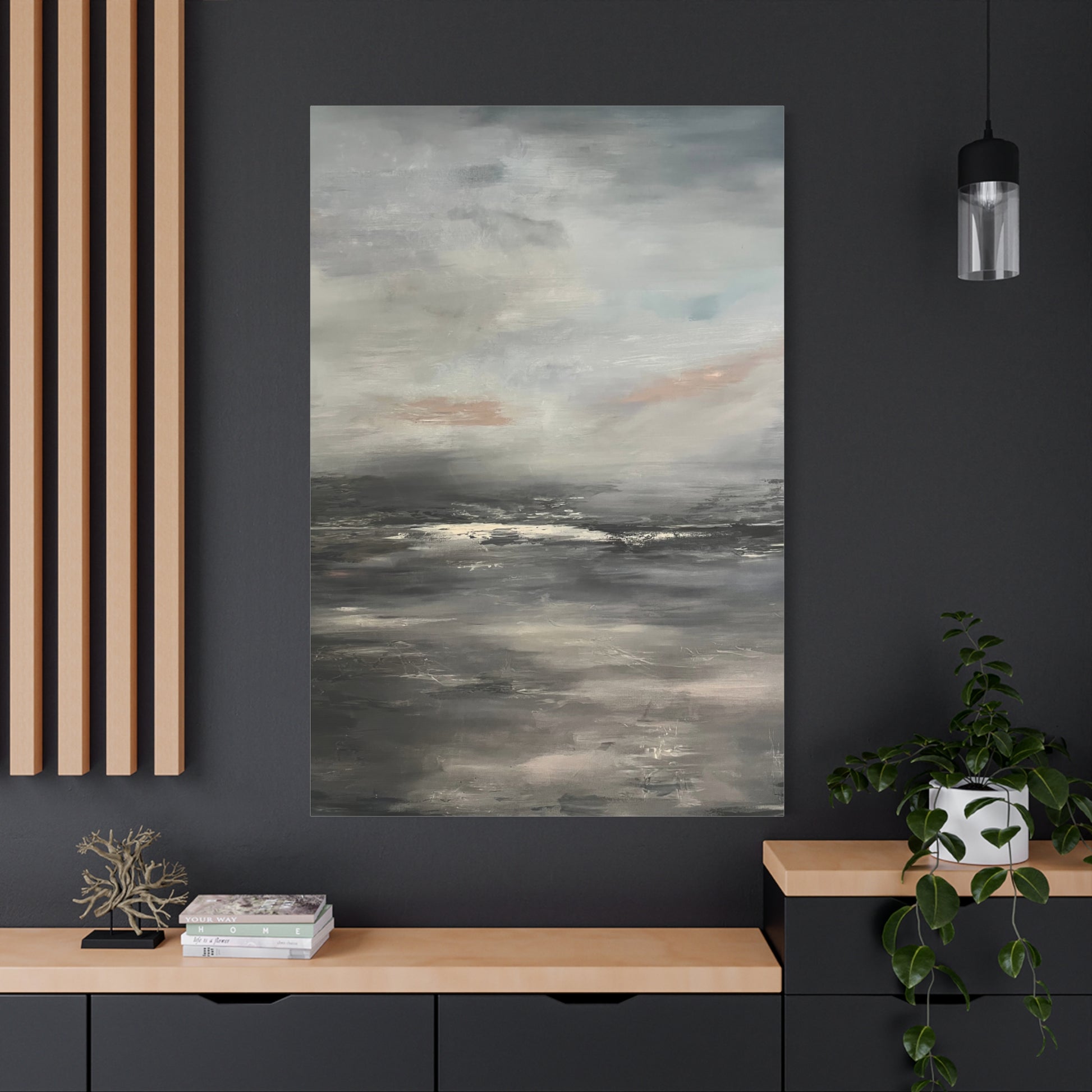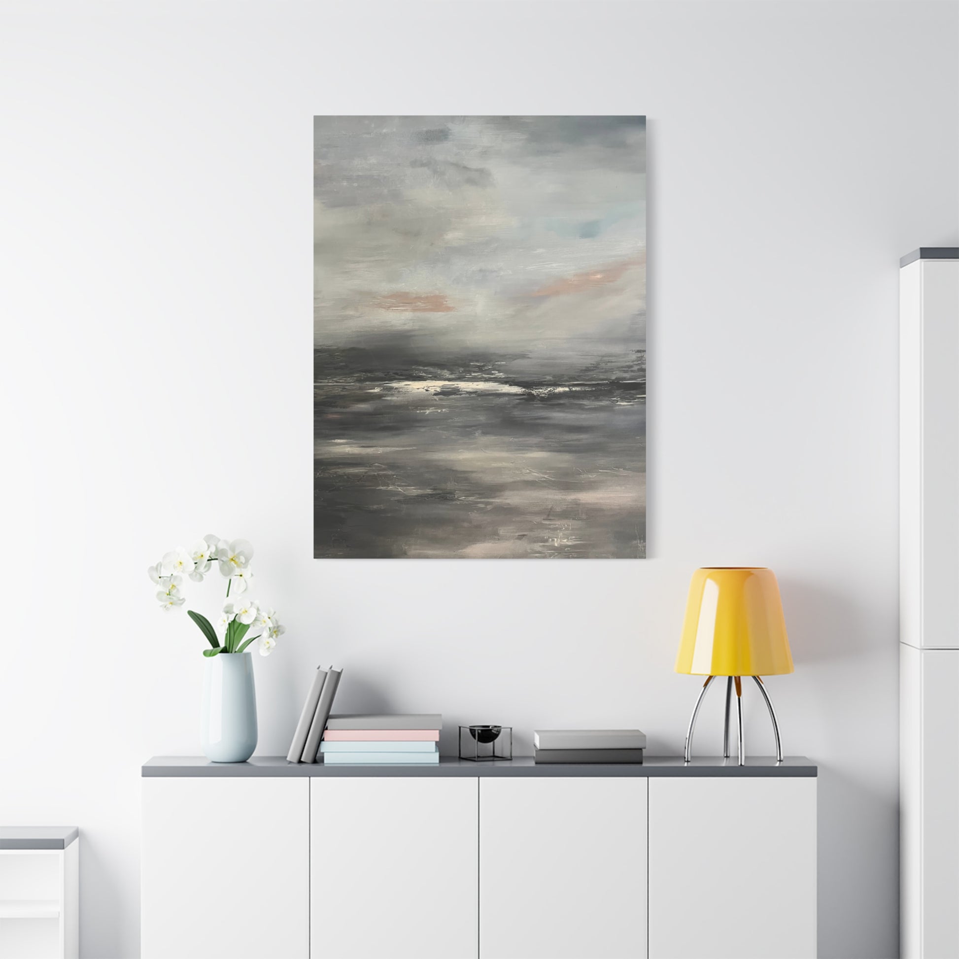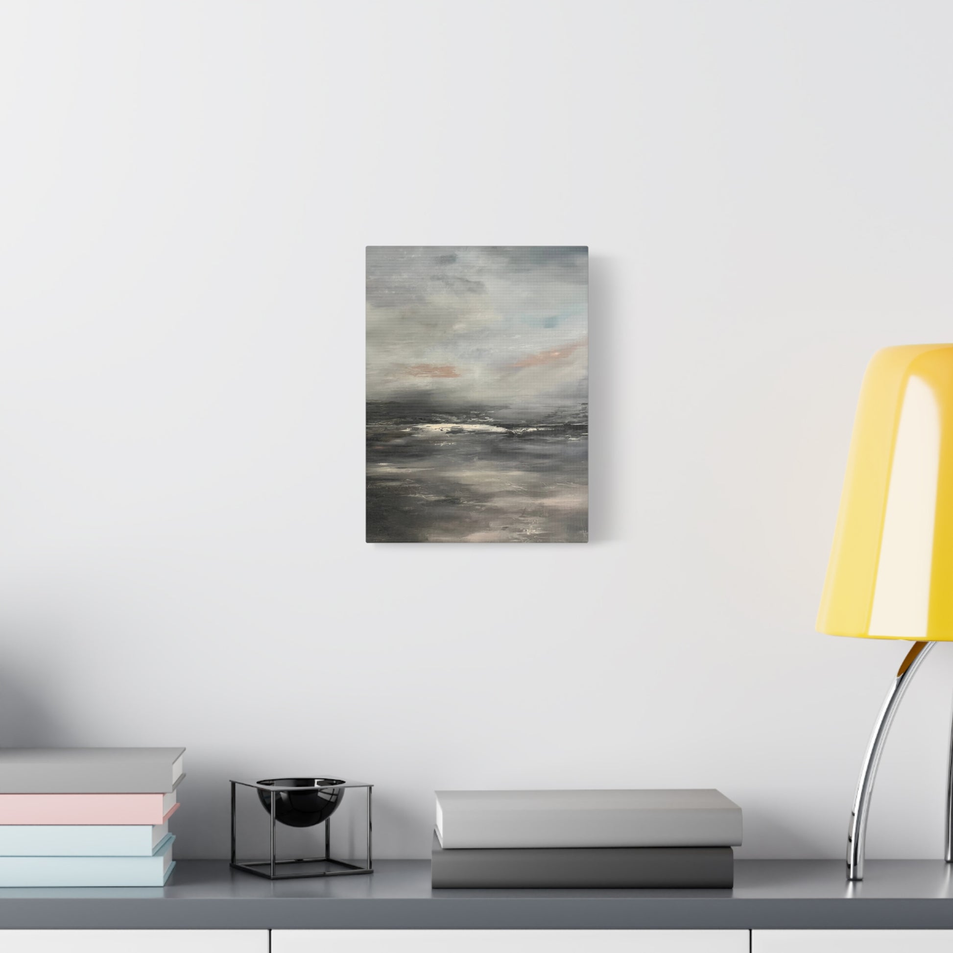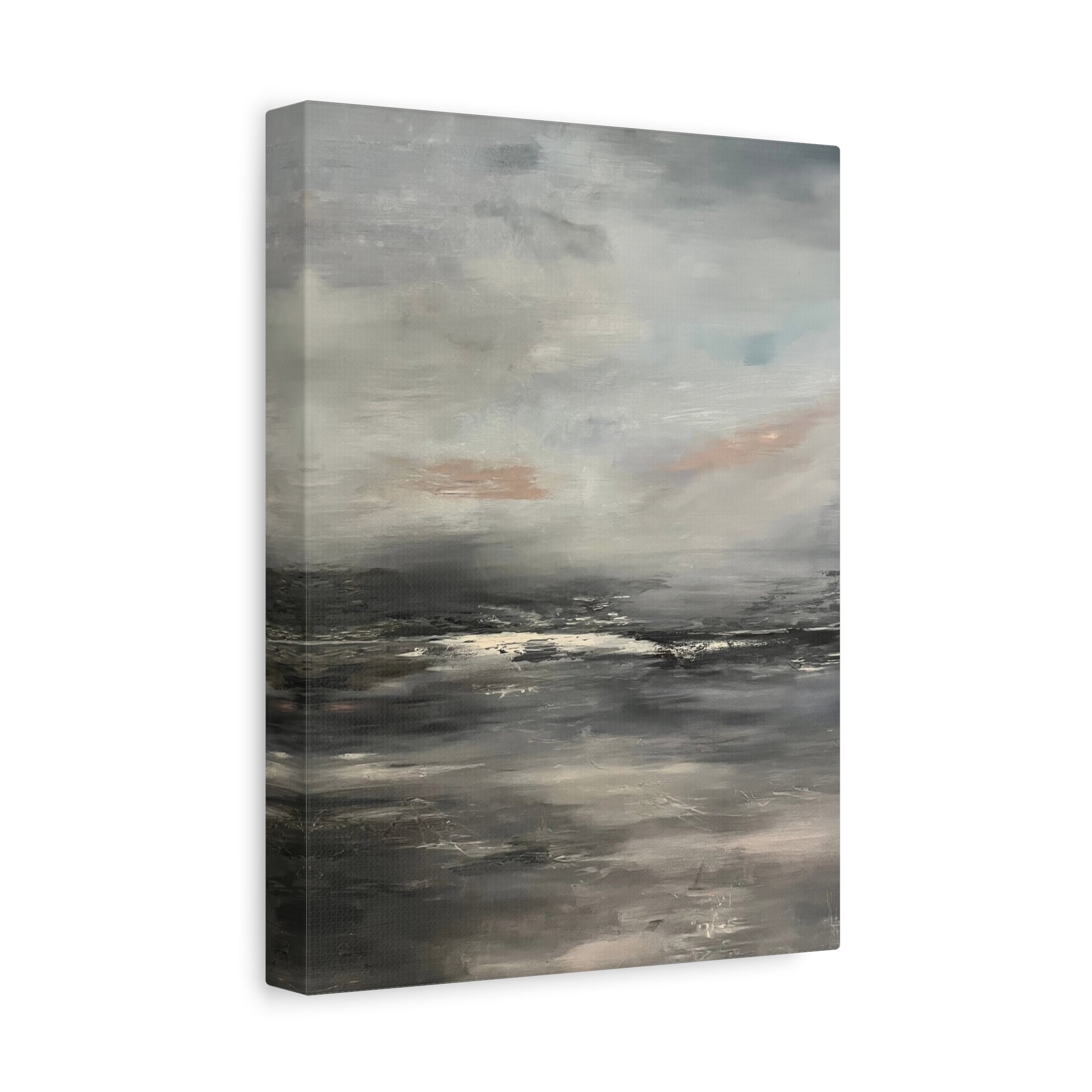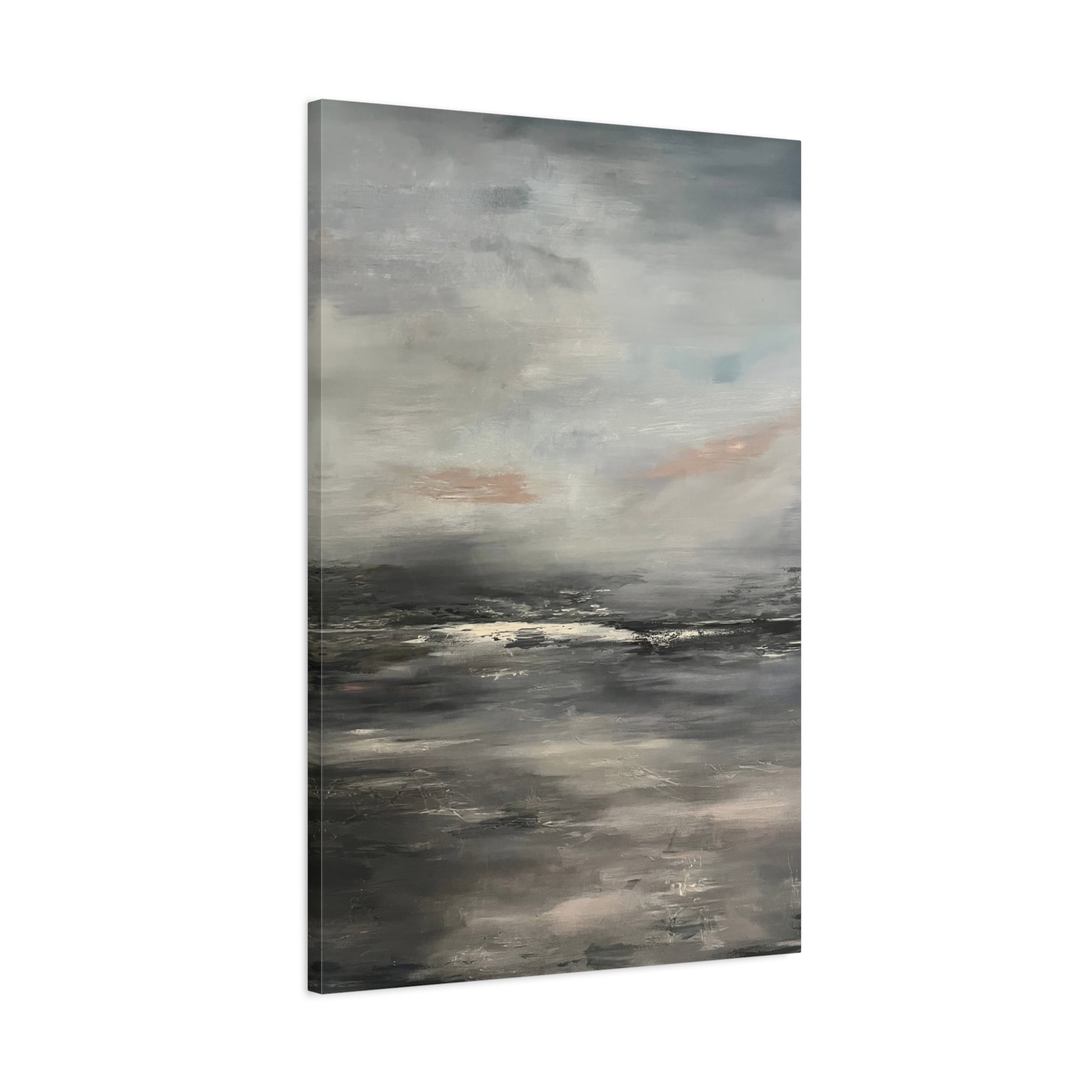 A serene abstract seascape blending soft grays, muted blues, and gentle taupe tones. The painting evokes the calm of a misty shoreline at dawn, where the horizon fades into a tranquil haze. Subtle layers of light and shadow create depth and quiet movement, capturing the peaceful stillness between sea and sky.