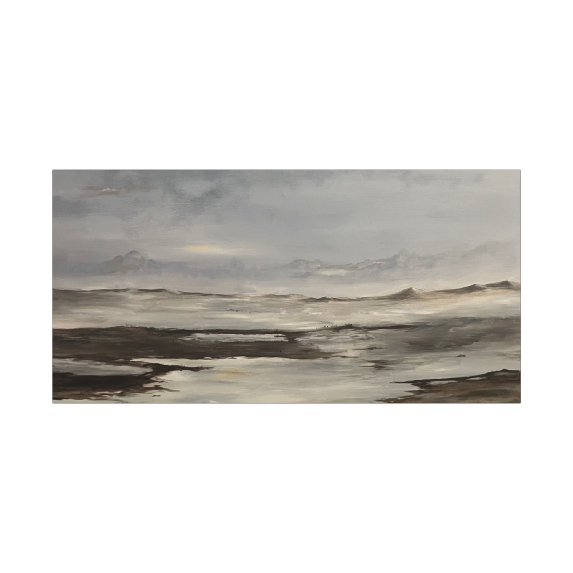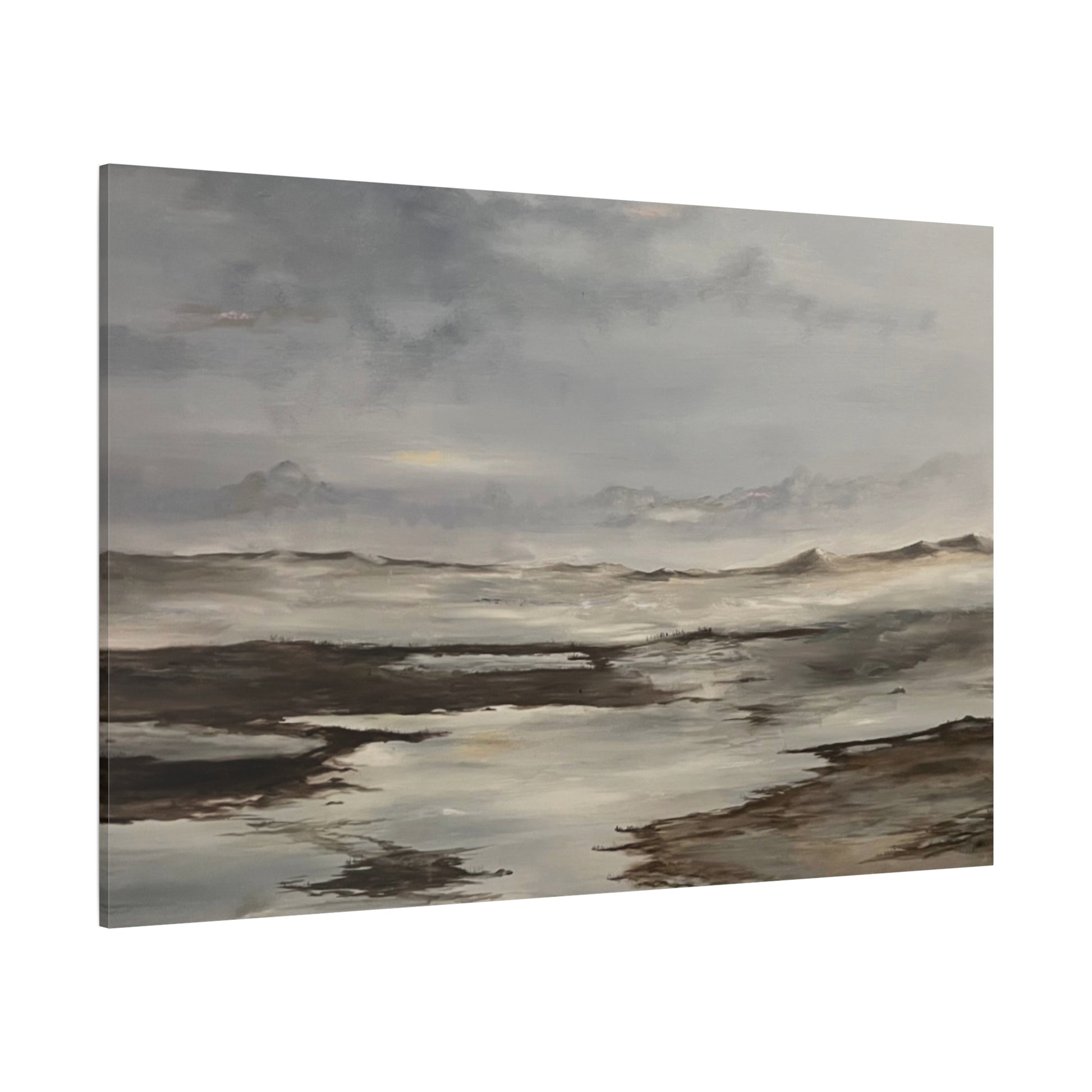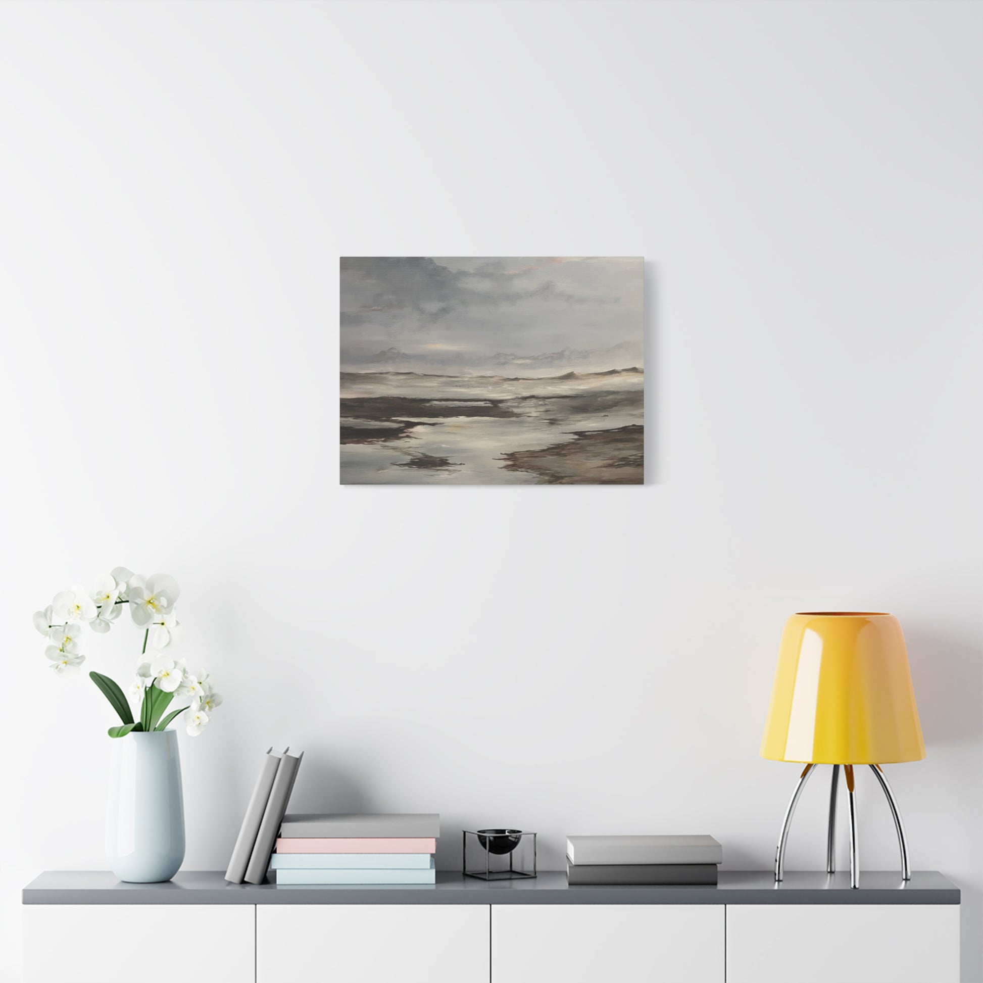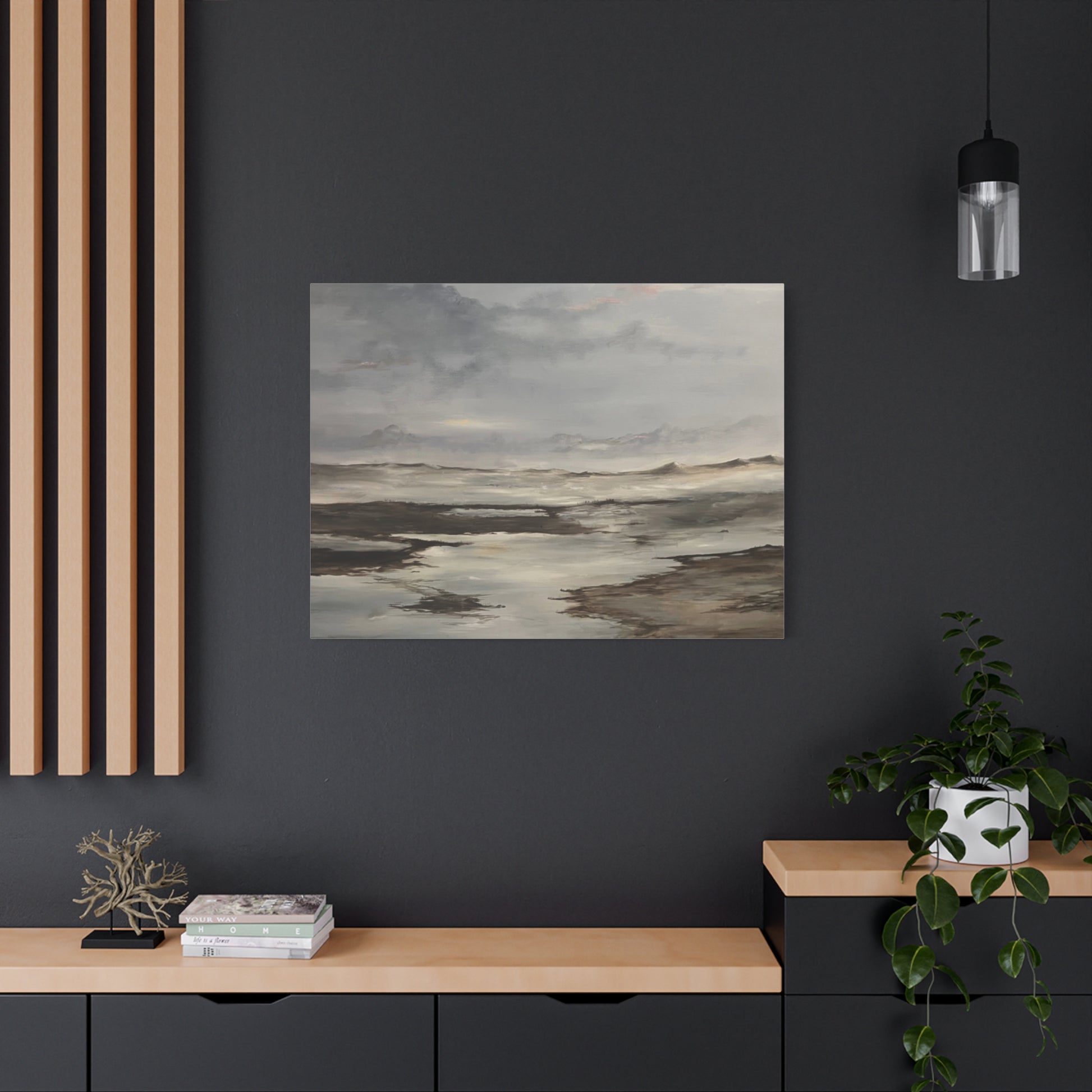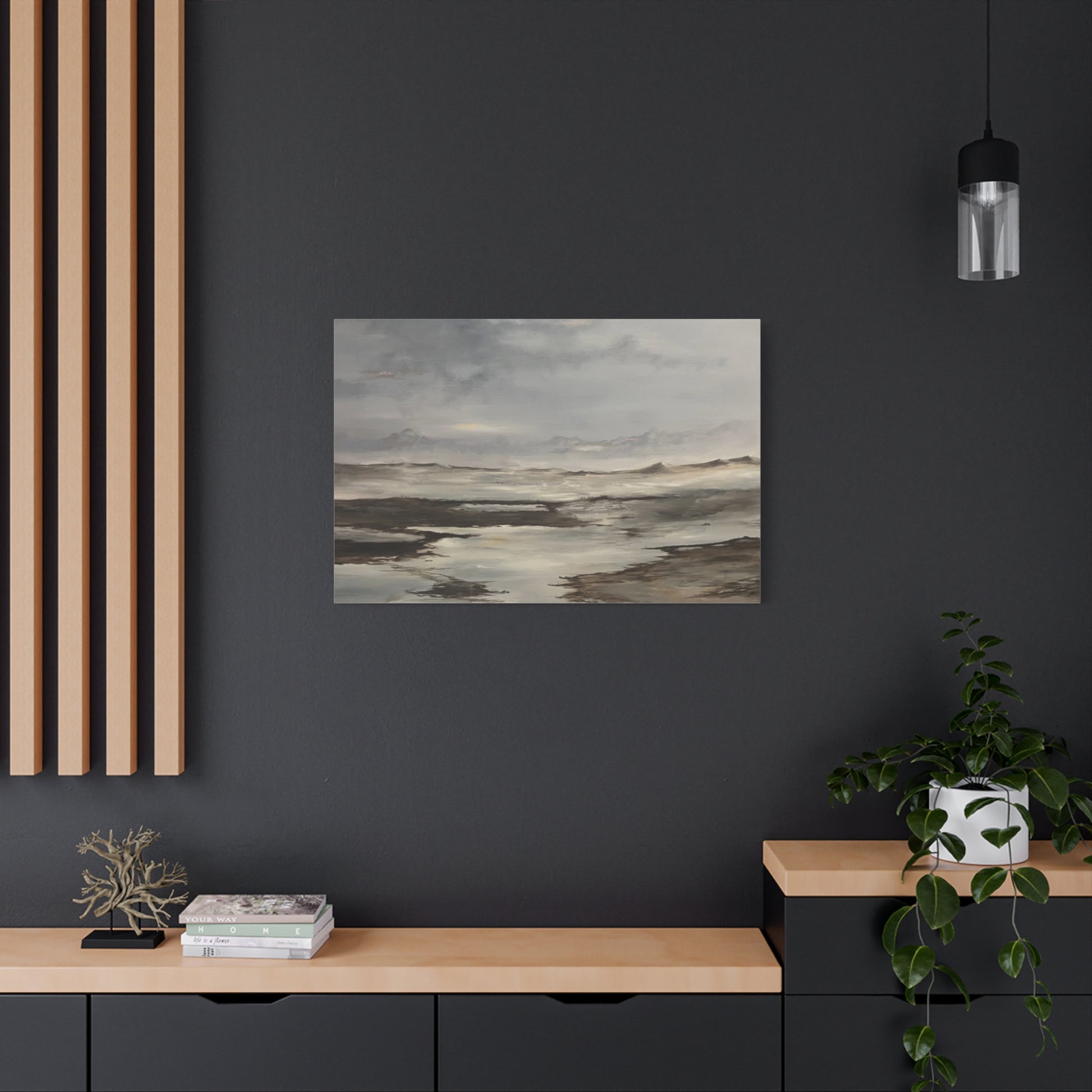 An expansive coastal landscape rendered in soft grays and muted earth tones. The calm water mirrors the overcast sky above, while gentle waves and distant hills fade into the mist. Hints of warm light peek through the clouds, adding quiet depth and tranquility to this serene, reflective scene.