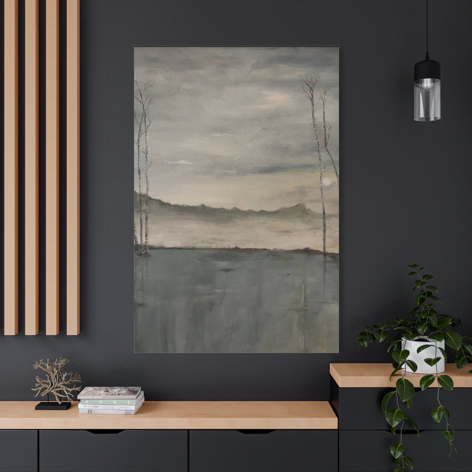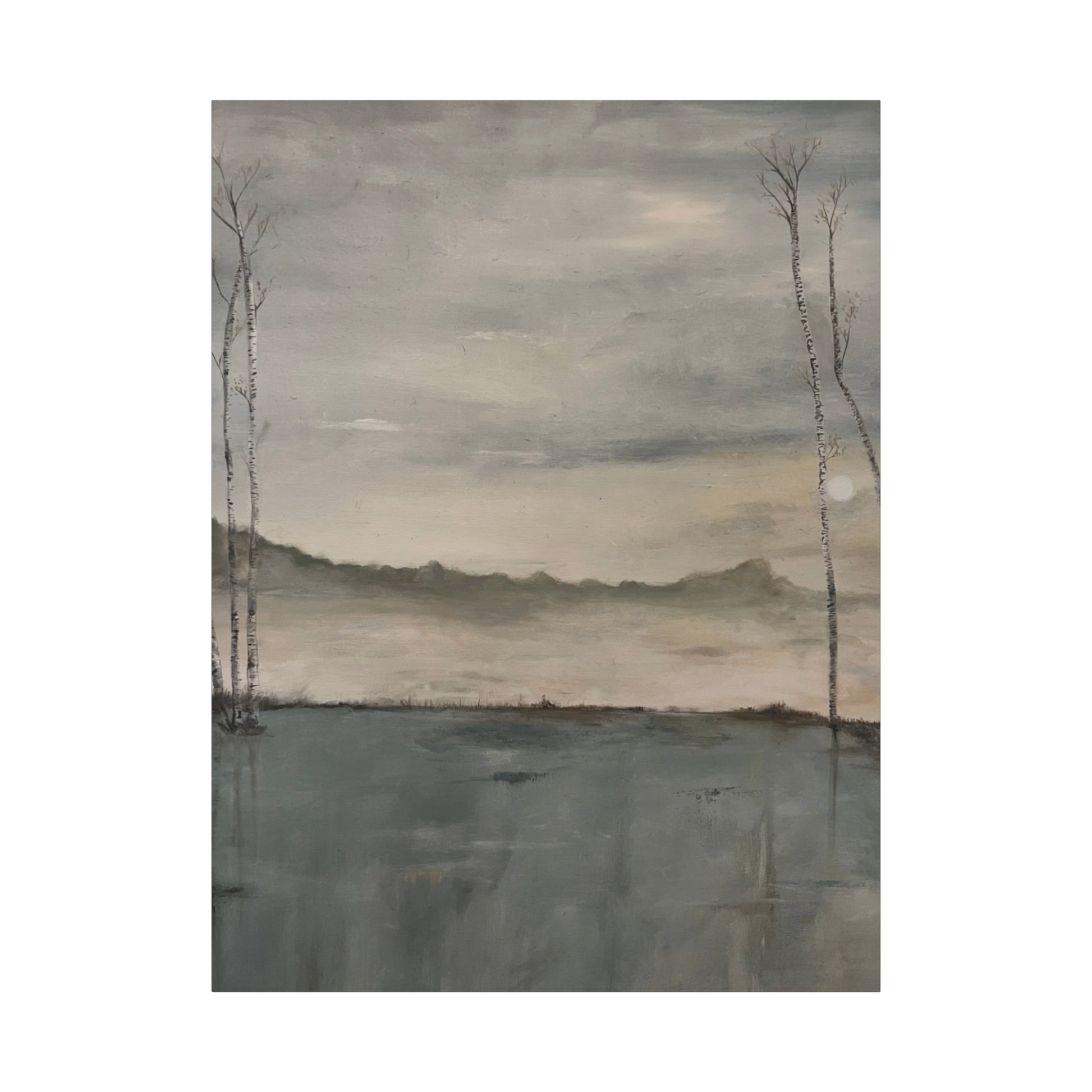 A tranquil lakeside scene painted in soft grays and muted blues, evoking the stillness of dawn. Slender birch trees rise on either side, their reflections gently mirrored in the calm water below. Mist drifts across the distant hills as the faint sun begins to emerge, creating an atmosphere of quiet reflection and peace.