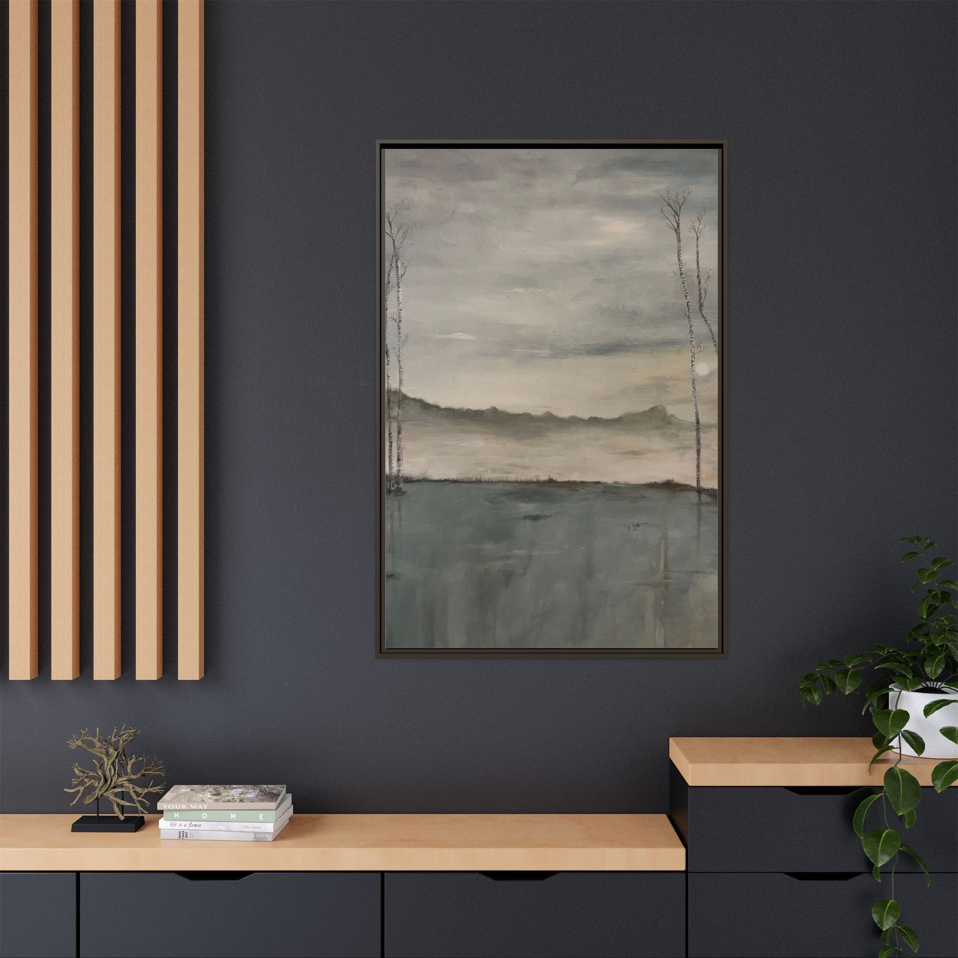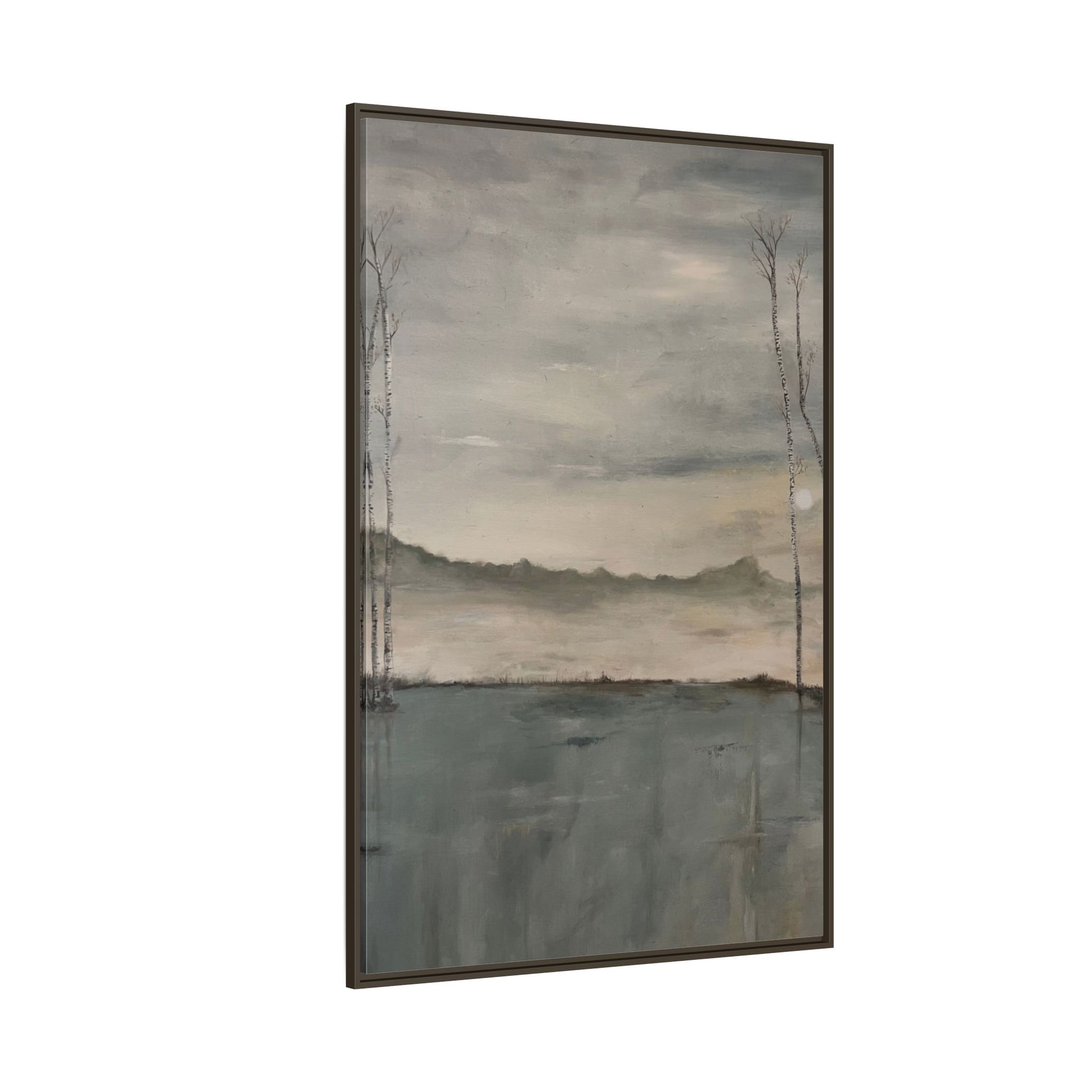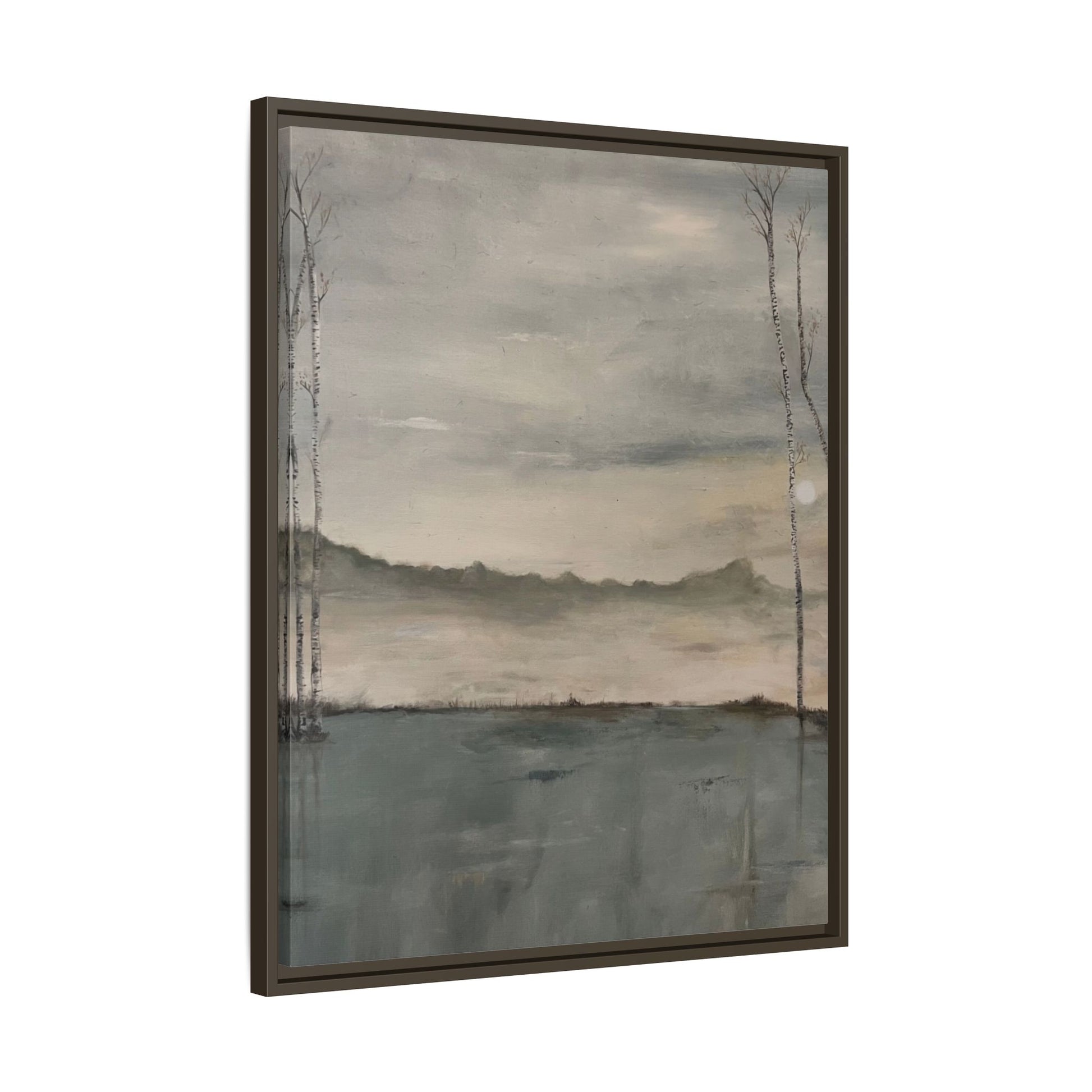 A tranquil lakeside scene painted in soft grays and muted blues, evoking the stillness of dawn. Slender birch trees rise on either side, their reflections gently mirrored in the calm water below. Mist drifts across the distant hills as the faint sun begins to emerge, creating an atmosphere of quiet reflection and peace.