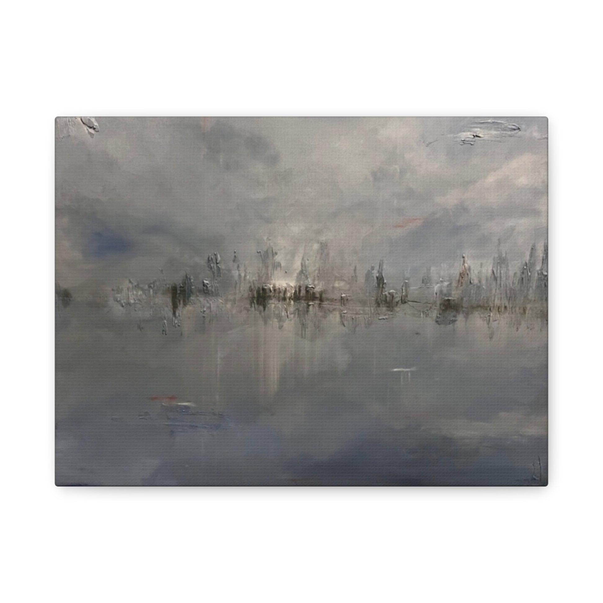 An ethereal landscape emerges through mist and reflection, where soft grays and silvers blur the line between water and sky. Subtle texture and depth suggest a distant horizon or city skyline shrouded in fog. The muted palette and atmospheric blending create a dreamlike calm, evoking stillness and quiet contemplation.